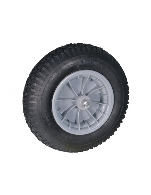 Standaard kruiwagenwiel 400x8 met kunststof velg, luchtband en binnenband. Inclusief as van 13 cm, bevestigingsbouten en beschermdoppen.