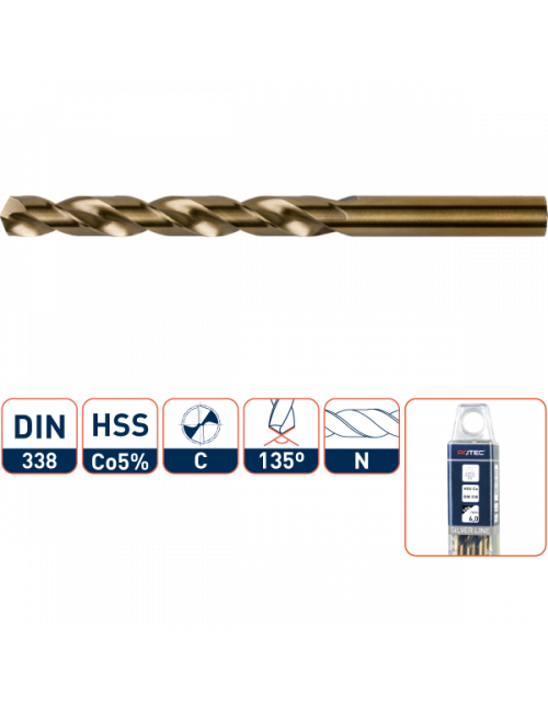 HSS-E Spiraalboor DIN 338, kort, type N, geslepen uitvoering, cobalt gelegeerd, goudkleurig, tophoek 135°, met splitpoint / kruisaanslijping (DIN 1412-C).