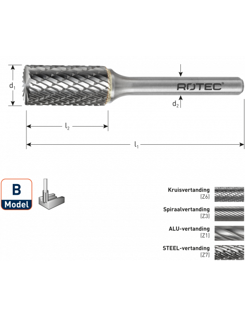 Hardmetalen stiftfrees in cilindervorm, met kopvertanding, in diverse vertandingen. Model B (ISO: ZYA-S).