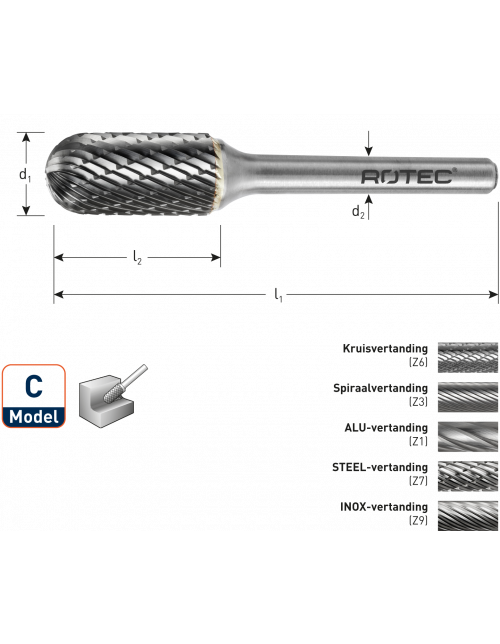 Hardmetalen stiftfrees in cilindervorm met ronde kop, in diverse vertandingen.