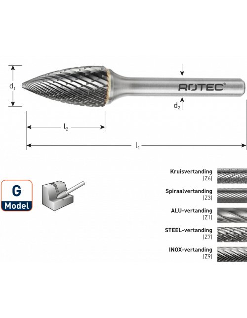 Hardmetalen stiftfrees in boomvorm spits, in diverse vertandingen.