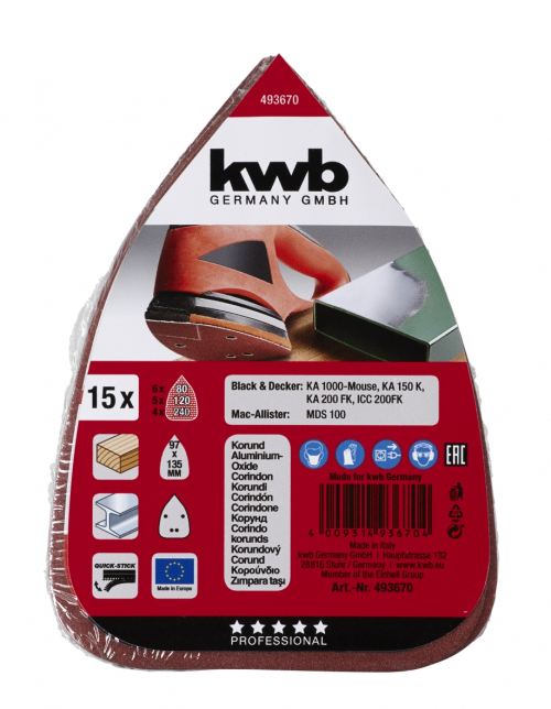 kwb Schuurdriehoeken, hout en metaal, edelkorund, 96 x 136 mm Quick stick -- Schuurdriehoeken, HOUT & METAAL, edelkorund, 96 x 136 mm, met aluminiumoxide bestrooid, gebonden met volledig synthetisch hars, versterkt dragermateriaal, met velours rug, geperforeerd, voor delta-/driehoekschuurmachines, voor het schuren van metaal, hout, verf, lak, plamuur, steen en kunststof.