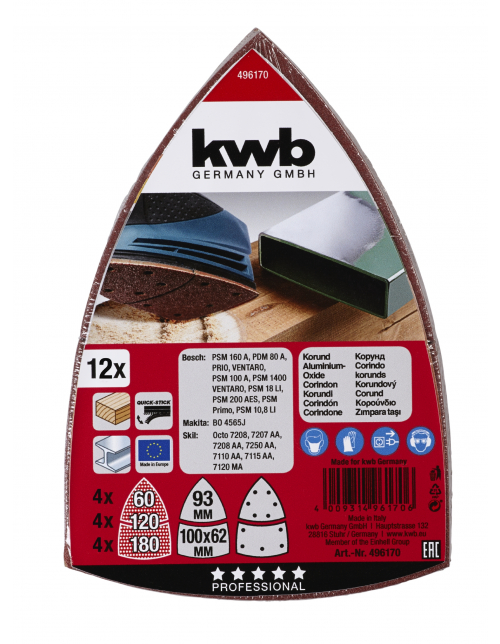kwb Schuurdriehoeken, hout en metaal, zelfhechtend, 100 x 62, 93 mm -- Schuurdriehoeken, HOUT & METAAL, edelkorund, 100 x 62, 93 mm, met aluminiumoxide bestrooid, gebonden met volledig synthetisch hars, versterkt dragermateriaal, met velours rug, geperforeerd, voor delta-/driehoekschuurmachines, voor het schuren van metaal, hout, verf, lak, plamuur, steen en kunststof. Voor delta-/driehoekschuurmachine Bosch PSM 160 A, PRIO, VENTARO, Skil Octo 7208