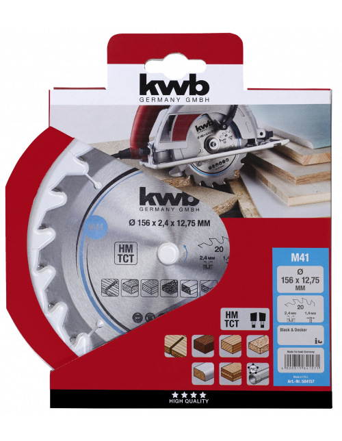 kwb Spaanplaat-cirkelzaagbladen voor cirkelzagen ø 156 x 12,75 mm -- Met hardmetaal versterkt, snelle en zuivere snede. Normaal getand, voor handcirkelzagen. Voor massief hout, spaanplaten met coating (werk- en keukenwerkbladen), meubel-, spaan- en hardvezelplaten en glasvezelversterkte kunststof.