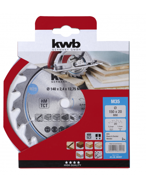 kwb Spaanplaat-cirkelzaagbladen voor cirkelzagen ø 150 x 20 mm -- Met hardmetaal versterkt, snelle en zuivere snede. Normaal getand, voor handcirkelzagen. Voor massief hout, spaanplaten met coating (werk- en keukenwerkbladen), meubel-, spaan- en hardvezelplaten en glasvezelversterkte kunststof.