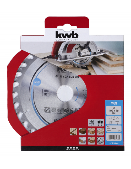 kwb Spaanplaat-cirkelzaagbladen voor cirkelzagen ø 190 x 30 mm -- Met hardmetaal versterkt, snelle en zuivere snede. Normaal getand, voor handcirkelzagen. Voor massief hout, spaanplaten met coating (werk- en keukenwerkbladen), meubel-, spaan- en hardvezelplaten en glasvezelversterkte kunststof.