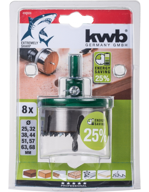 kwb Meerkransengatenzagen, 8-delig -- Met gepatenteerde spaansleuven voor meer vermogen en sneller werken.Gatenzaag, 8-delig, zware zinken gespuitgiete steunschijf, zaagkrans van gehard veerstaal, tandpunten inductief gehard, voor gebruik in hout, hout met kunststofcoating, hardhout, spaanplaten, gipsplaten, lichte bouwplaten, kunststof en koper.