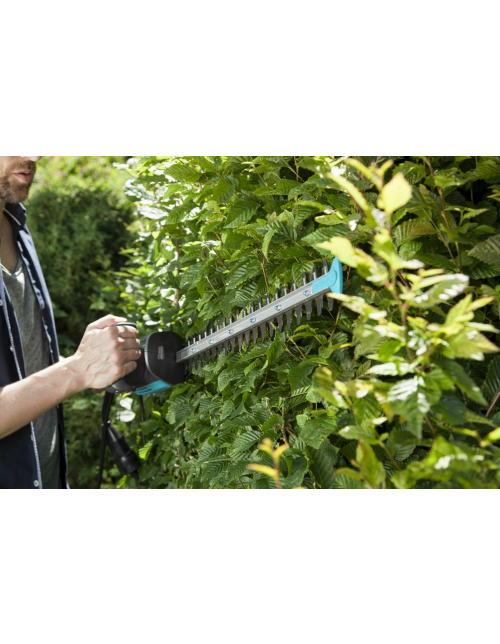 Lichte elektrische heggenschaar met ergonomisch gevormde handgreep voor comfortabel en veilig snoeien van kleine en grote heggen.